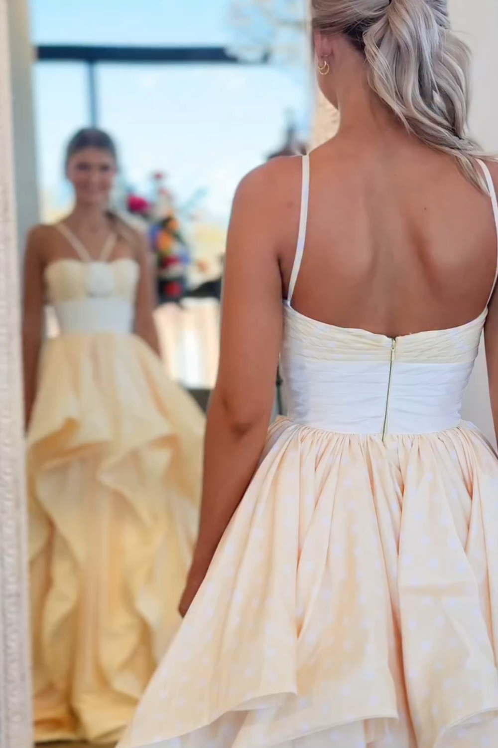 Black White Dot A Line Halter Floral Long Prom Dress with Ruffles