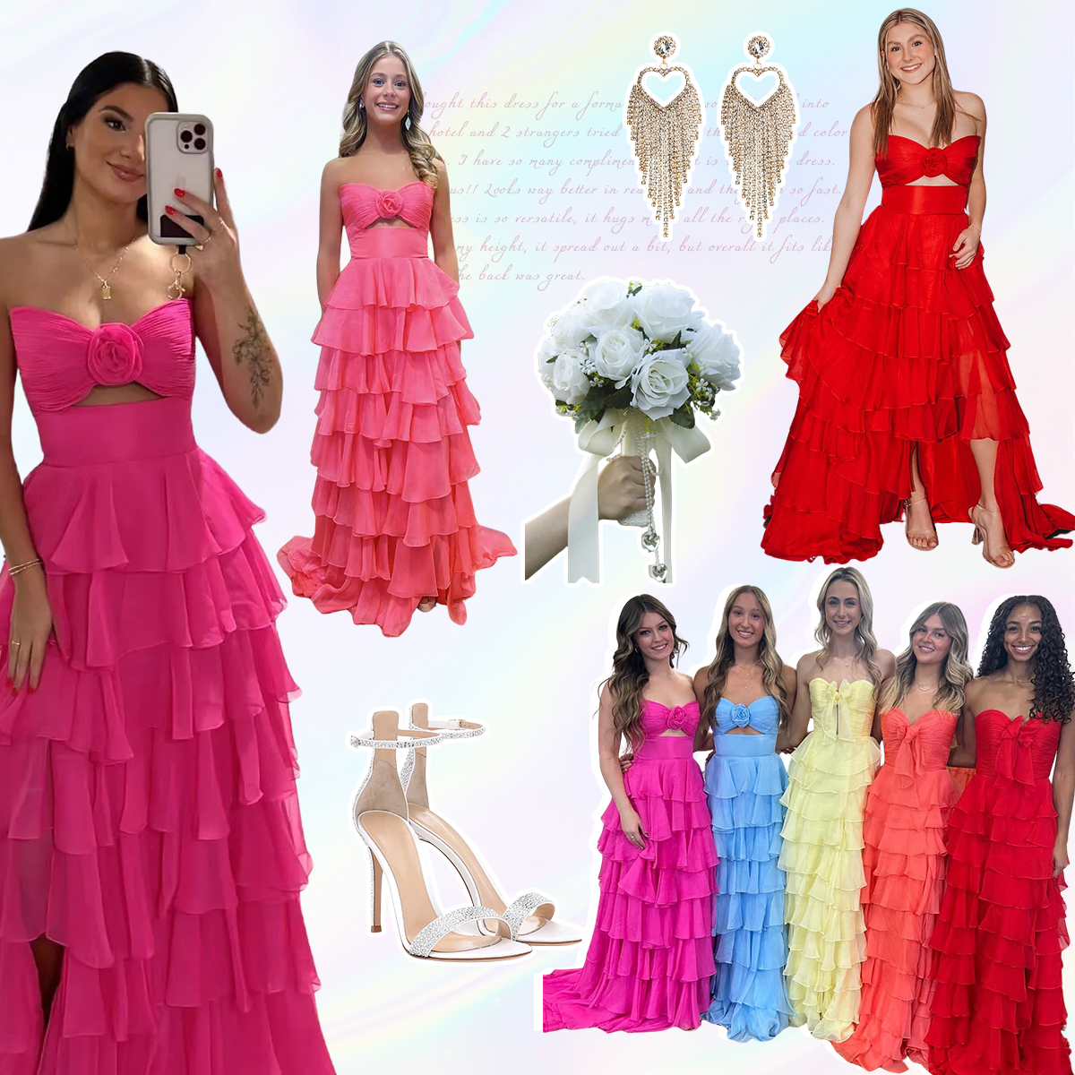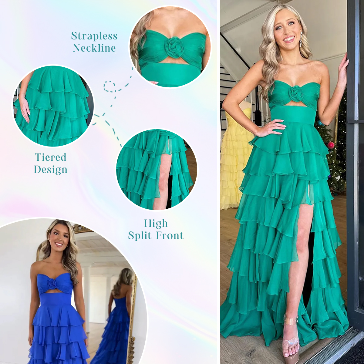 Feature: Turn heads in this stunning a line prom dress. Made from luxurious chiffon, it features a keyhole bodice with folwer details, a strapless design, ruching, tiered, and a built-in bra for a flawless fit. The daring front split and sweep train add modern elegance, making it perfect for prom or special events. Get ready to shine and receive endless compliments!
