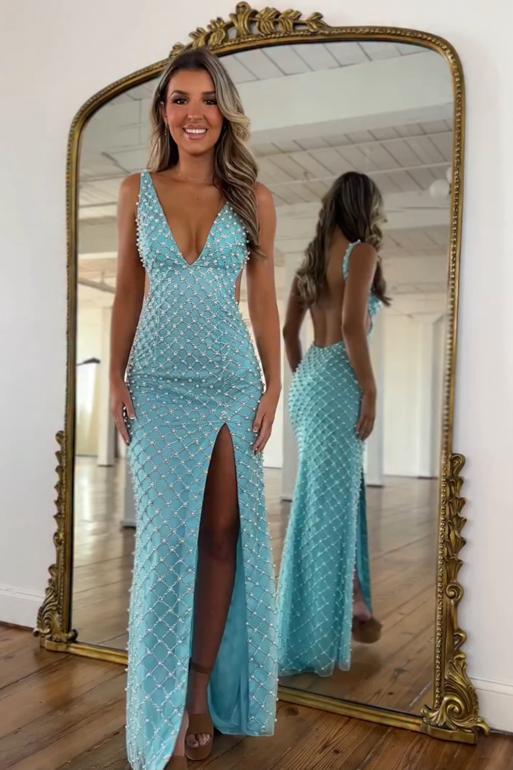 Blue Sheath V-Neck Pearls Long Prom Dress with Slit