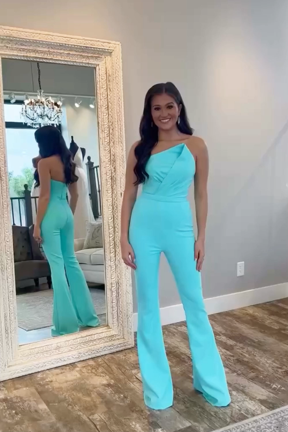 Blue Tight Satin Strapless Flare Leg Long Prom Homecoming Jumpsuits