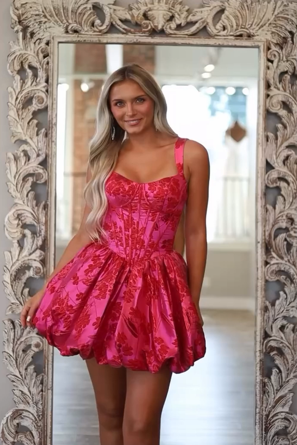 Floral Fuchsia A Line Off the Shoulder Short Corset Homecoming Dress