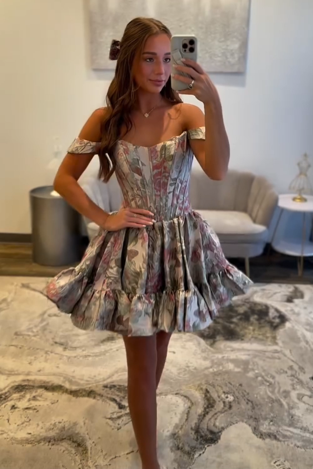 Floral Yellow A Line Jacquard Ruffled Short Corset Homecoming Dress