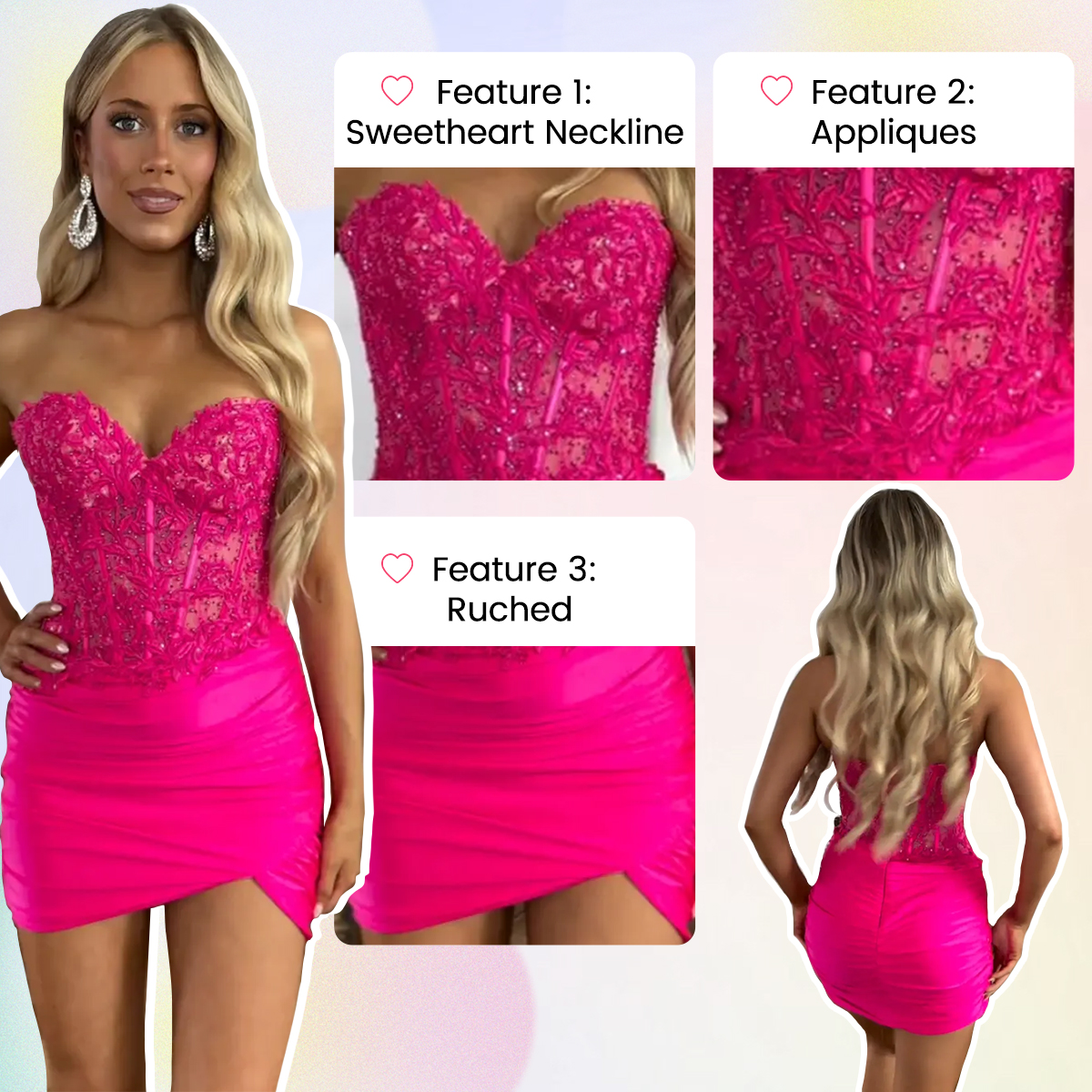 Featured: Turn heads in this stunning sparkly short prom dress. Made from soft fabric, it features a bodycon bodice with appliqued details, a strapless design, and a built-in bra for a flawless fit. The daring front ruched add modern elegance, making it perfect for prom or special events. Get ready to shine and receive endless compliments!
