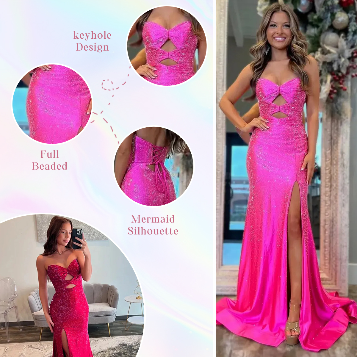 Feature: This stunning prom dress is designed to make you the center of attention! Crafted from satin fabric, it combines elegance with a bold design. The figure-hugging mermaid silhouette highlights your curves, while intricate beaded details add a touch of glamorous sparkle. The strapless design with a lace-up back ensures a sexy yet perfect fit. The daring high slit adds a modern edge to the dress, maintaining its timeless elegance. Get ready to shine and receive endless compliments!