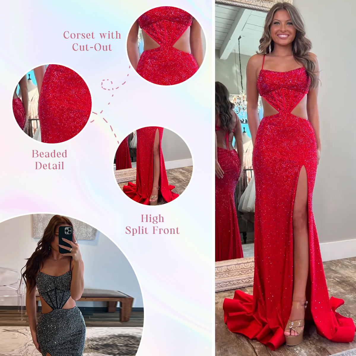 Feature: Turn heads in this stunning sparkly mermaid prom dress. Made from luxurious satin, it features a corset bodice with beaded details, a spaghetti straps design, cut-out, and a built-in bra for a flawless fit. The daring front split and sweep train add modern elegance, making it perfect for prom or special events. Get ready to shine and receive endless compliments!