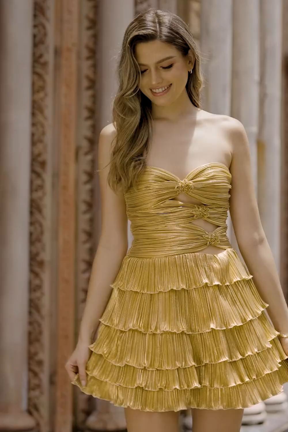 Featured: Radiate golden glamour in this strapless mini dress designed to captivate. The fitted bodice showcases three bold cutouts adorned with sparkling bead accents, creating a daring yet elegant look. The pleated desine shimmers under the light, while the tiered ruffle skirt adds lively bounce and playful movement to every step. A true statement piece that blends flirty charm with show stopping shine.