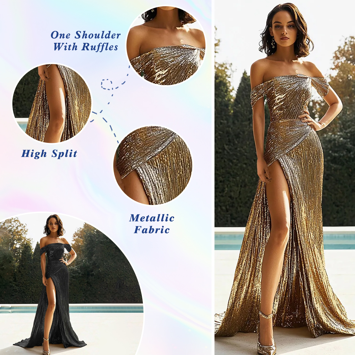 Featured: Turn heads in this stunning sparkly prom dress. Made from luxurious metallic fabric, it features a sleek sheath silhouette with ruched detailing that enhances your curves. The one-shoulder design adds a touch of sophistication, while the daring slit brings modern allure. Perfect for prom or any special occasion, this dress is designed to make you shine and collect endless compliments!