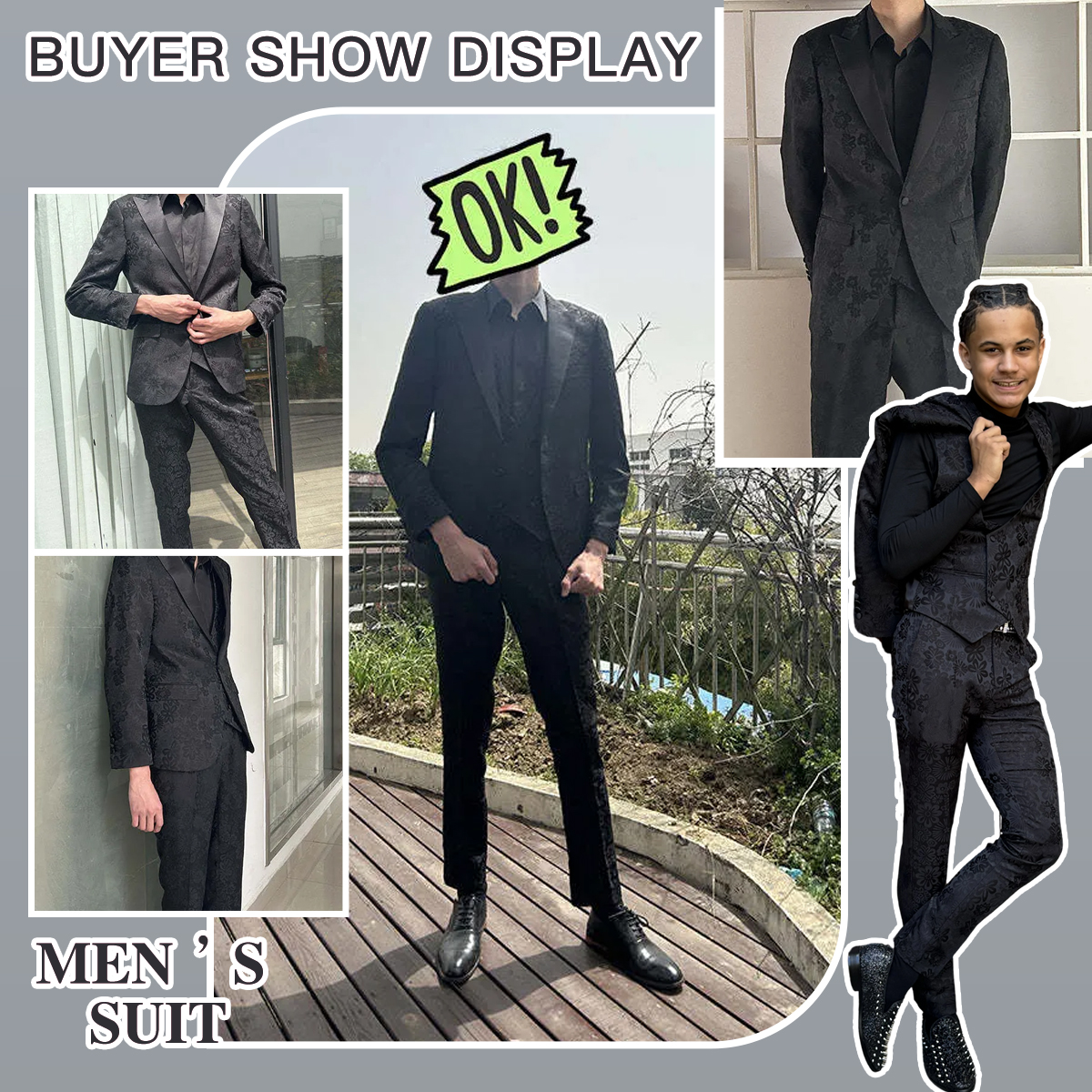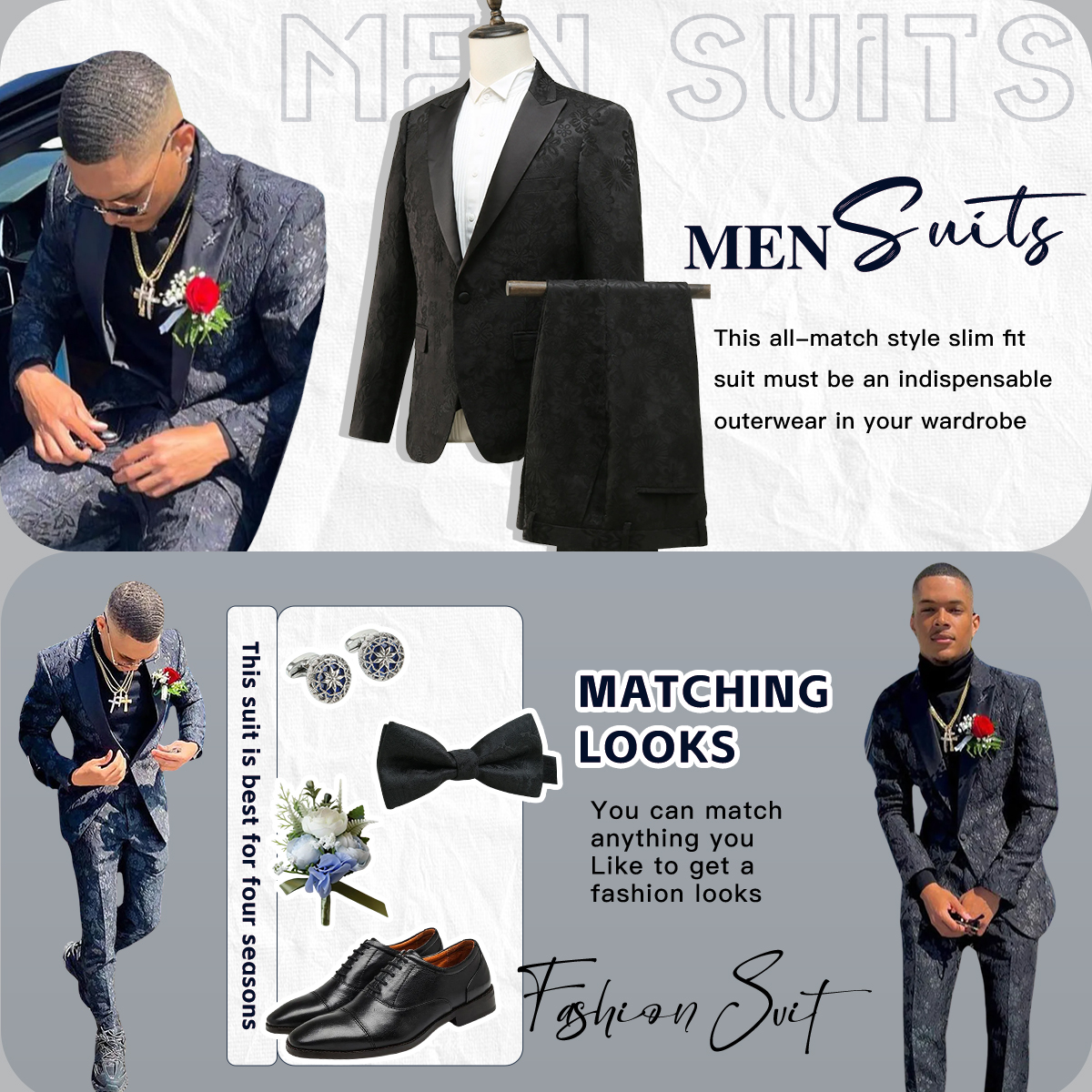 Feature: One button closure, single-breasted peak lapel, slim fit suit, and pants with flat front zippered fly button end.