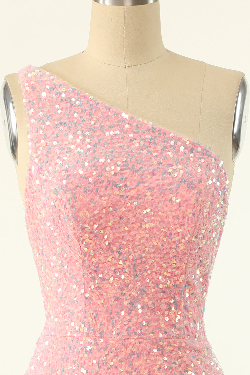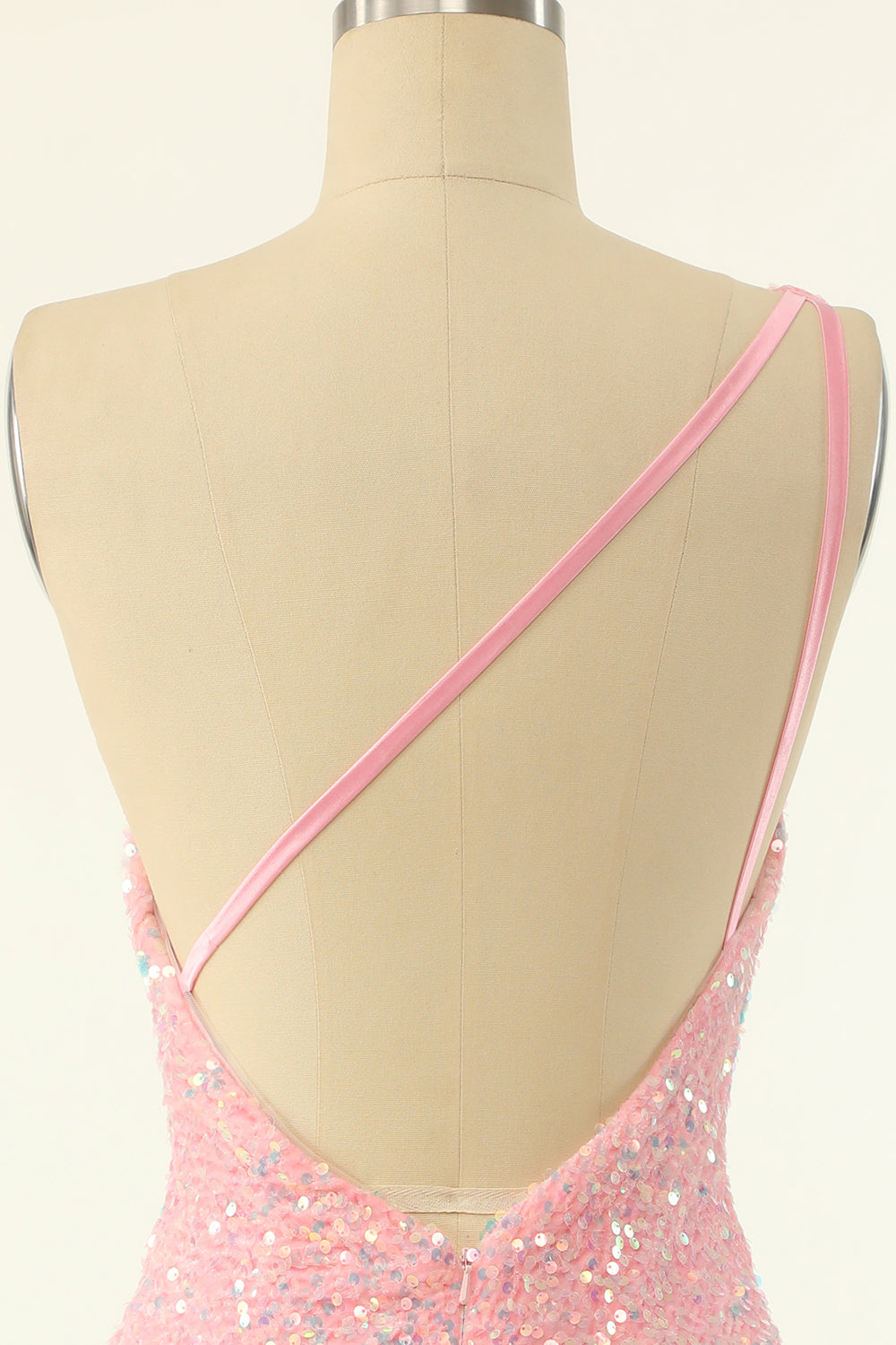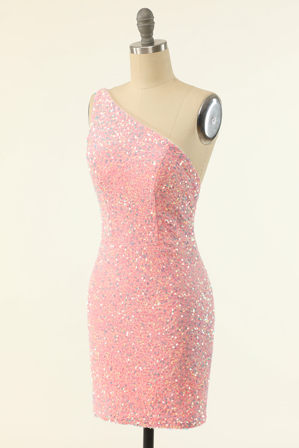 Pink One Shoulder Sequins Tight Homecoming Dress