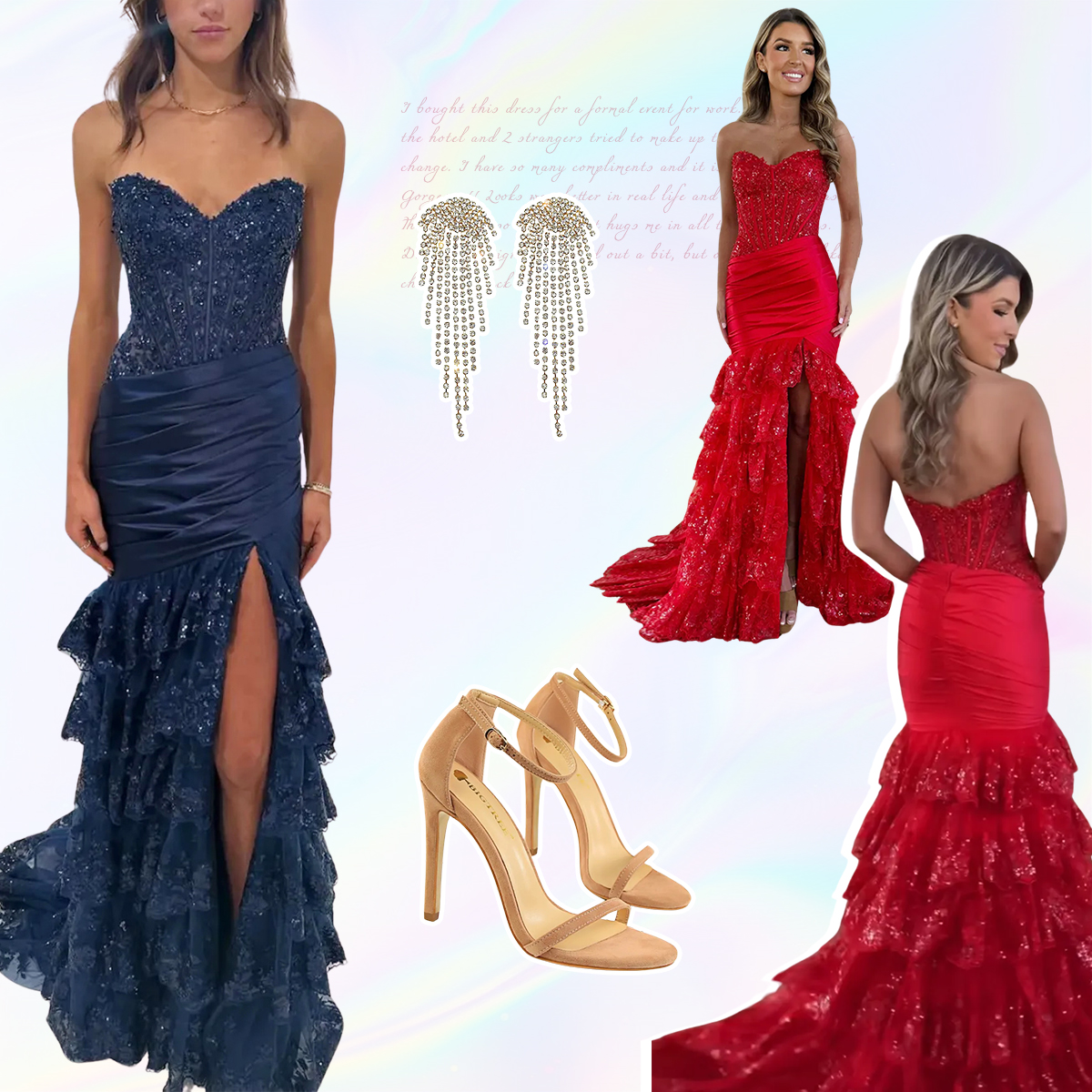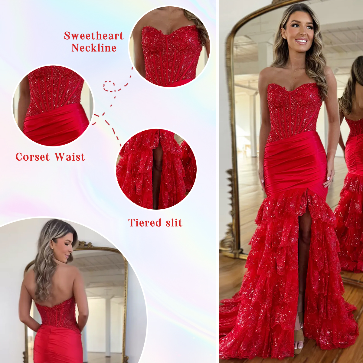 Feature: Long sparkly red prom dresses mermaid formal dress. Side split, corset waist, sweetheart neckline, built in bra, tulle with lace appliques material, you will receive many compliments on this.