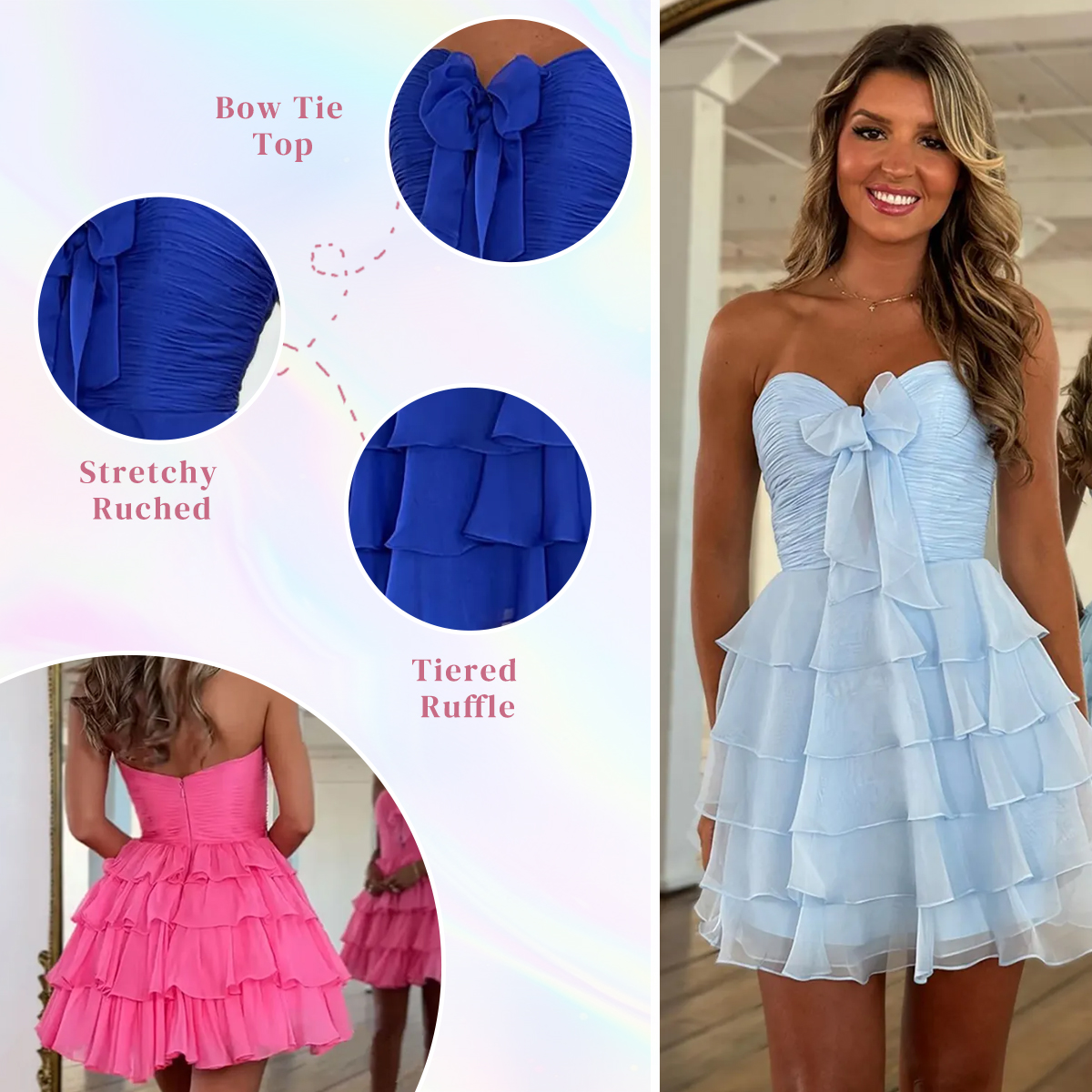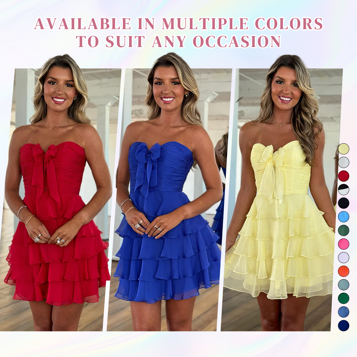 Featured: Radiate elegance and charm in this red strapless mini dress designed to steal the spotlight. The flattering A line silhouette features a ruched bodice with a chic keyhole, adding a hint of allure to the sweet, feminine design. A delicate bow at the top ties the look together, while the tiered skirt adds soft volume and playful bounce with every step. Finished with a hidden zipper back for a sleek fit, this dress is perfect for dancing, celebrating, and turning heads wherever you go.