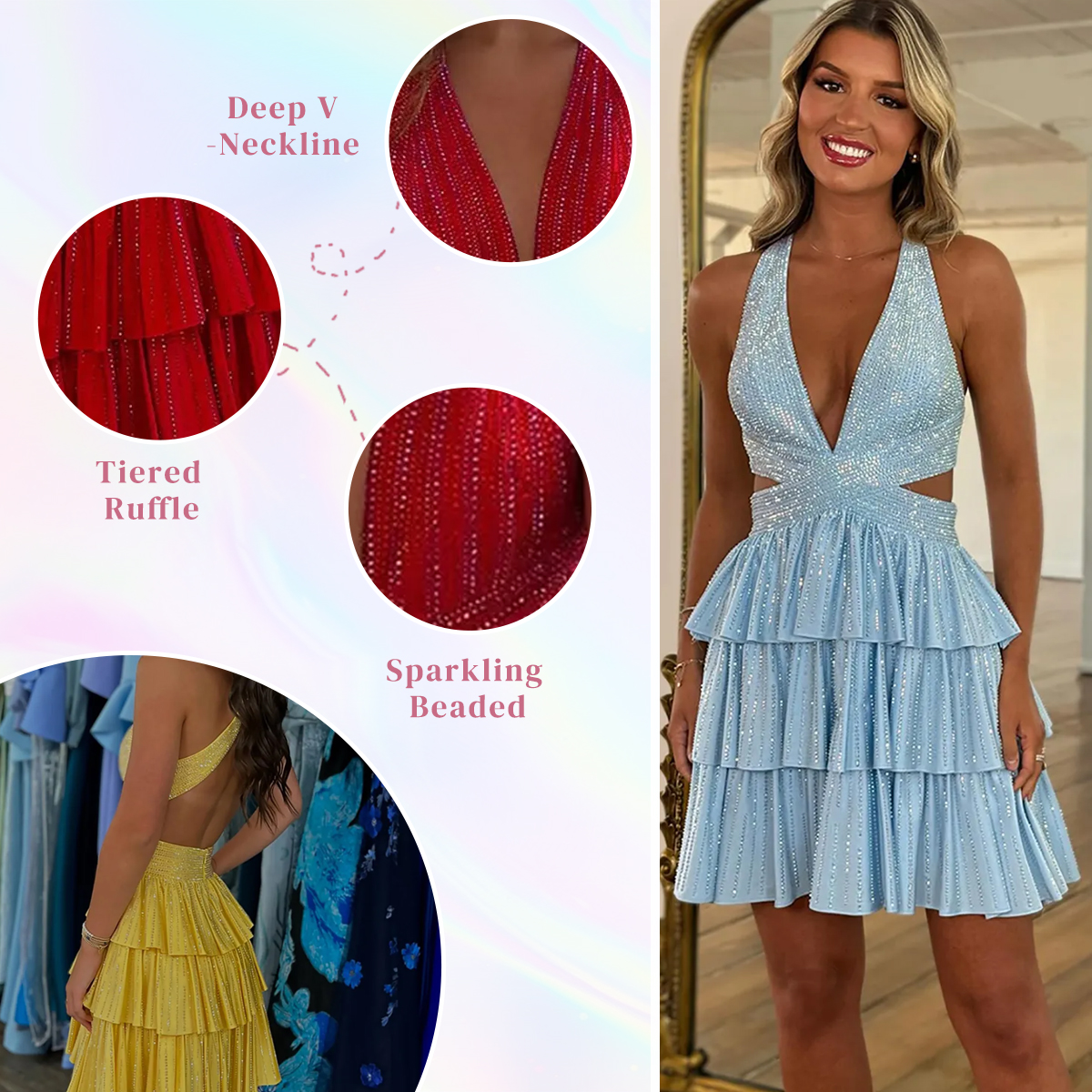 Featured: Shine bright and dance all night in this dreamy sparkle black mini dress. Featuring a plunging V-neckline and side cutouts at the waist, the fitted A-line bodice is adorned with dazzling rhinestones that catch the light from every angle. The playful tiered ruffle skirt adds volume, movement, and a fun flirty finish. Complete with an open back and secure halter strap, this dress combines elegance with a youthful edge—ready to turn heads at every celebration.