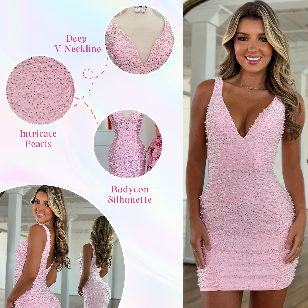Featured: Step into pure glamour with this striking light blue mini dress, fully adorned with radiant pearls that bring rich texture and dimensional shine. The plunging V-neckline adds allure, while the figure-hugging silhouette sculpts your shape for a confident, head-turning effect. A deep scoop back finishes the look with a bold, elegant touch—perfect for making a statement from every angle.