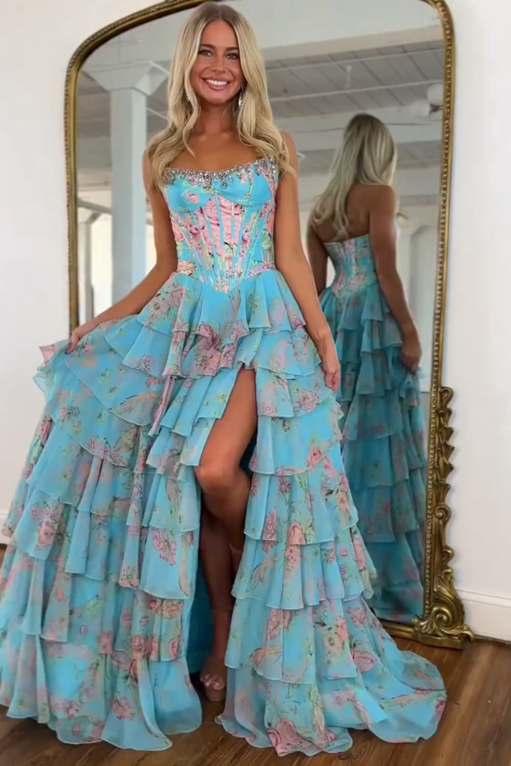 Featured: Step into a world of romance and whimsy with this stunning strapless gown. The corset-style bodice, adorned with intricate beadwork and floral embroidery, creates a flattering and structured fit. The layered ruffle design cascades elegantly, adding movement and dimension to the dress. The playful thigh-high slit offers a flirtatious touch, allowing for freedom of movement while showcasing a chic and modern appeal. The soft pastel blue and pink color palette further enhances its dreamy, feminine aesthetic.