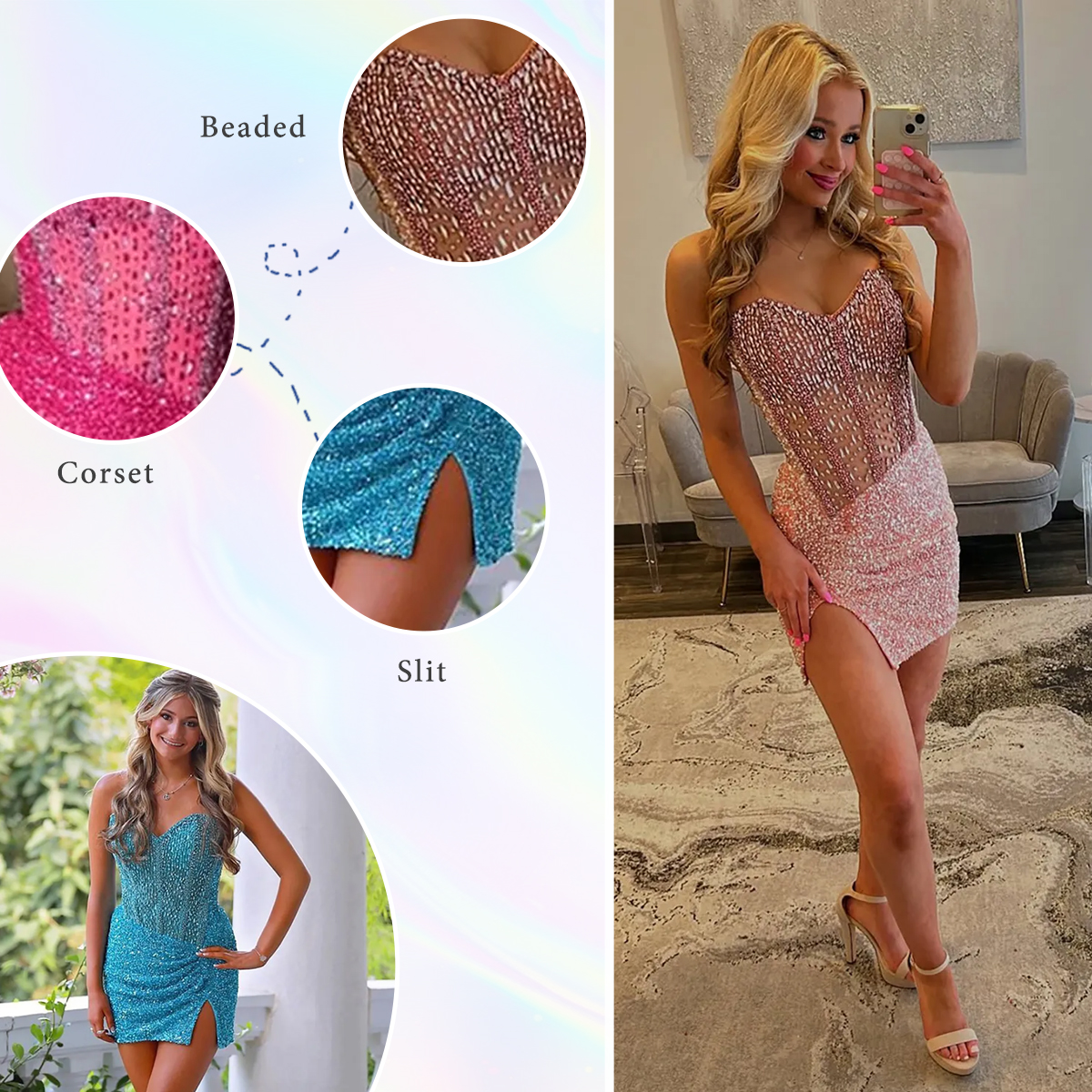 Featured: Shine bright in this stunning sparkly homecoming dress, featuring a flattering corset bodice and shimmering sequin finish. The sleek bodycon silhouette hugs your curves perfectly, while delicate rhinestone embellishments add extra sparkle and elegance. A bold, feminine choice that ensures you’ll stand out with confidence at any party or special night out.