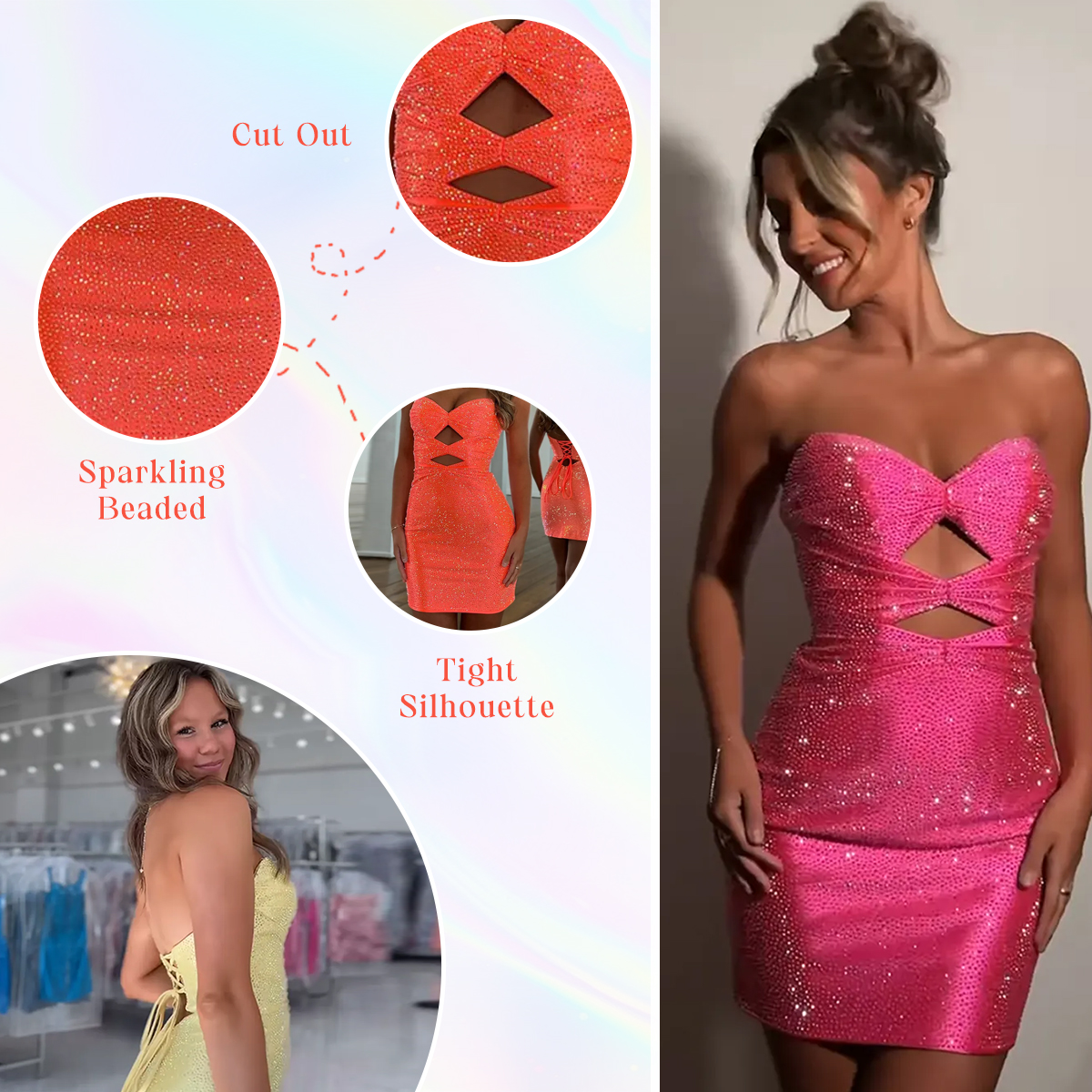 Featured: Step into the spotlight with this neon orange sweetheart dress that’s bursting with energy and charm. The fitted tight bodice features dazzling beaded rhinestones and bold cut outs that add a flirty edge, while the sparkle skirt brings fun, flouncy movement to every step. Finished with a lace-up back for a custom fit, this mini dress is perfect for homecoming, parties, or any night made for twirling, shining, and turning heads.