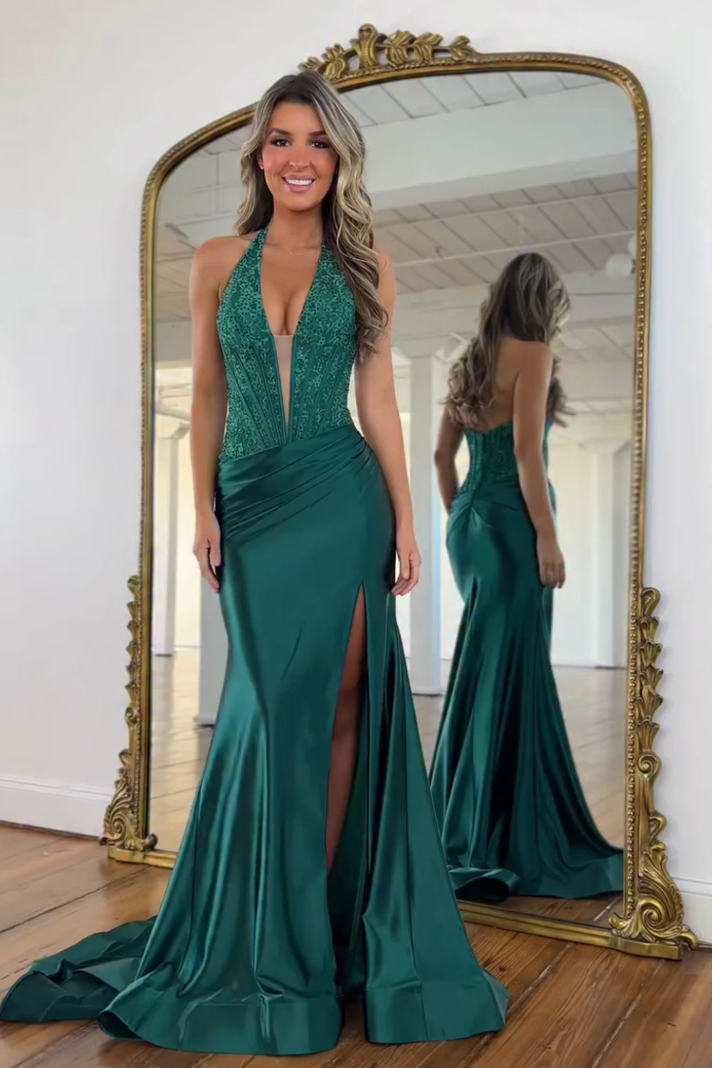 Sparkly Dark Green Corset Mermaid Beaded Long Prom Dress with Slit