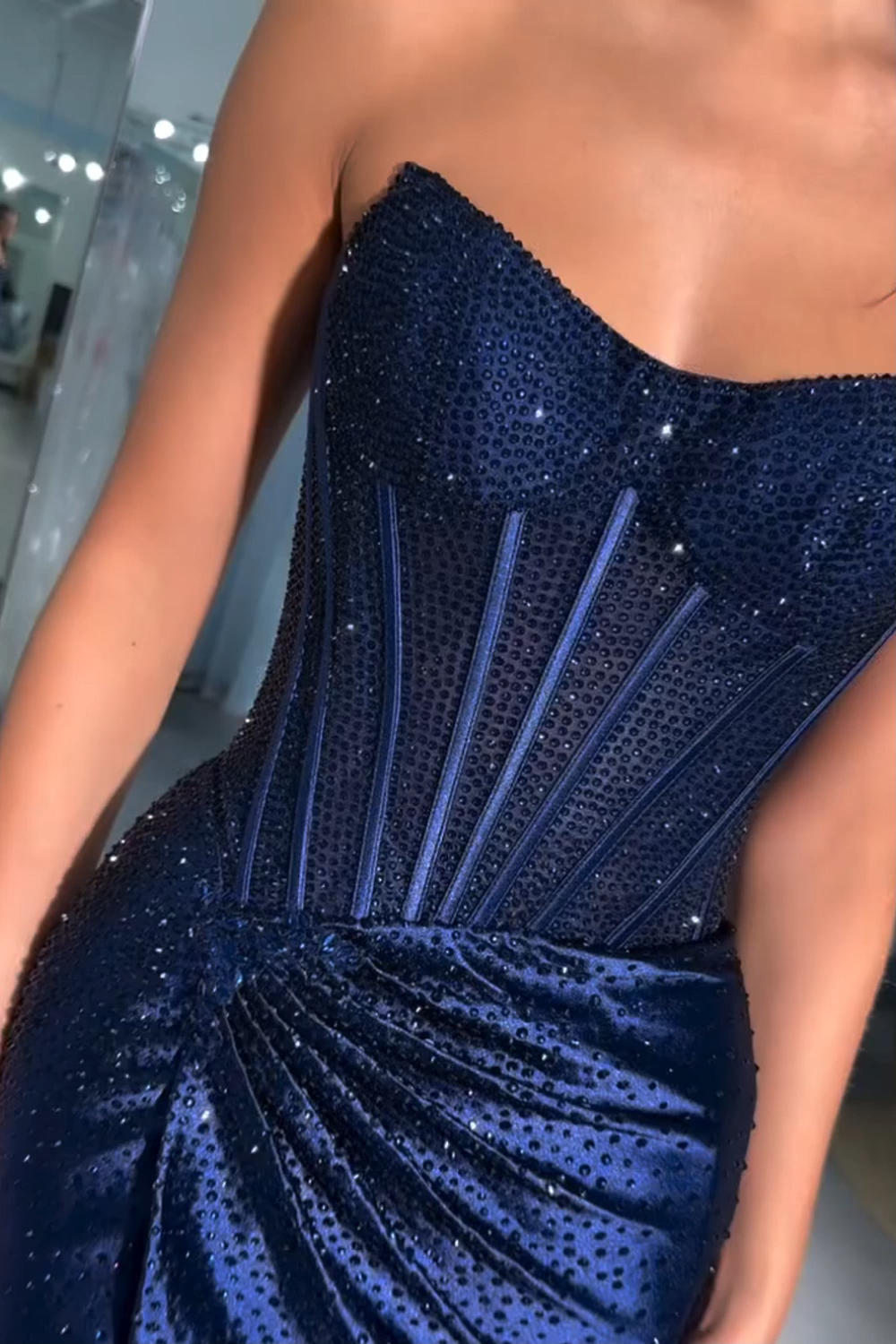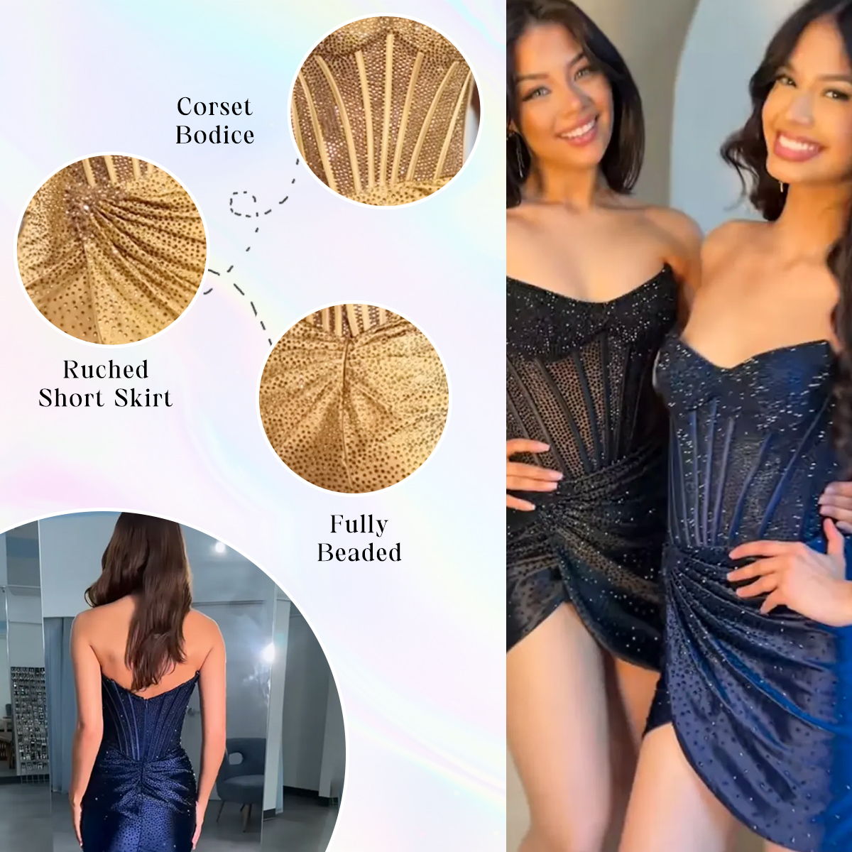 Featured: Step into the spotlight in this breathtaking strapless mini dress, where timeless elegance meets show stopping sparkle. The corset inspired bodice, adorned with hundreds of hand placed rhinestones, sculpts and lifts for a confidence boosting fit. Vertical boning creates a beautifully elongated silhouette, while the artfully draped tulip skirt flatters your curves and adds graceful movement. Every shimmer, every sparkle is designed to make you the woman everyone remembers.