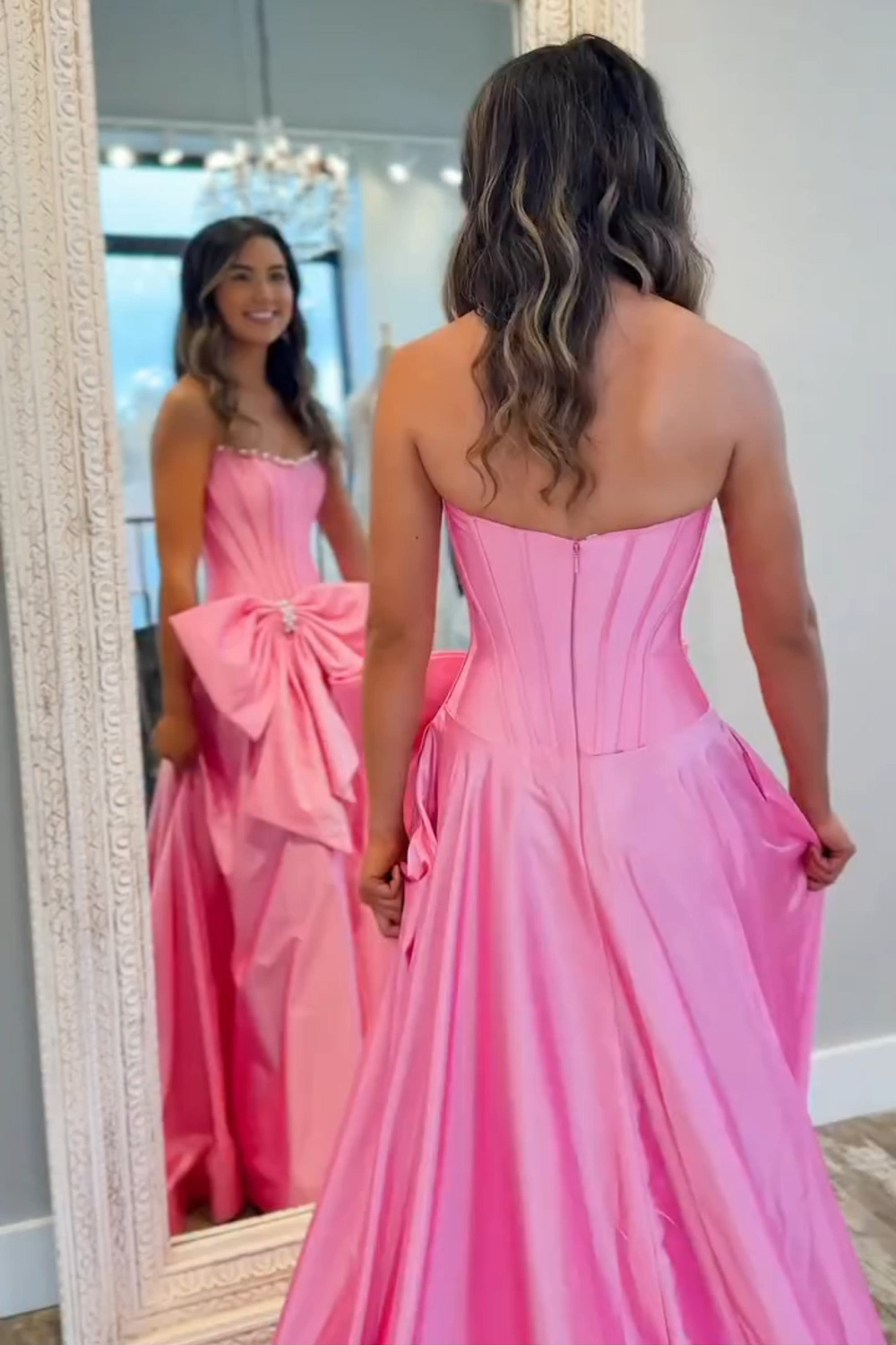 Sparkly Pink A-Line Strapless Beaded Long Corset Prom Dress with Bow