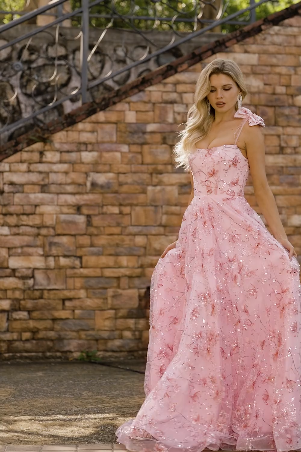 Sparkly Pink Spaghetti Straps A Line Long Floral Prom Dress with Bows