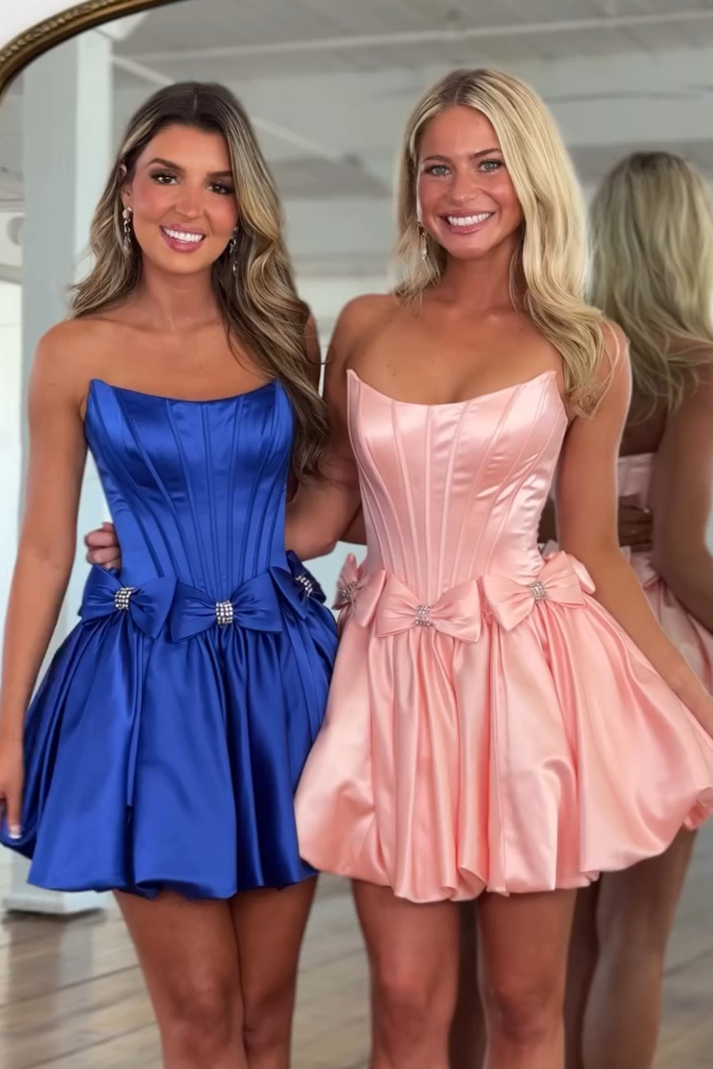 Sparkly Red Strapless Satin Short Corset Homecoming Dress with Bow