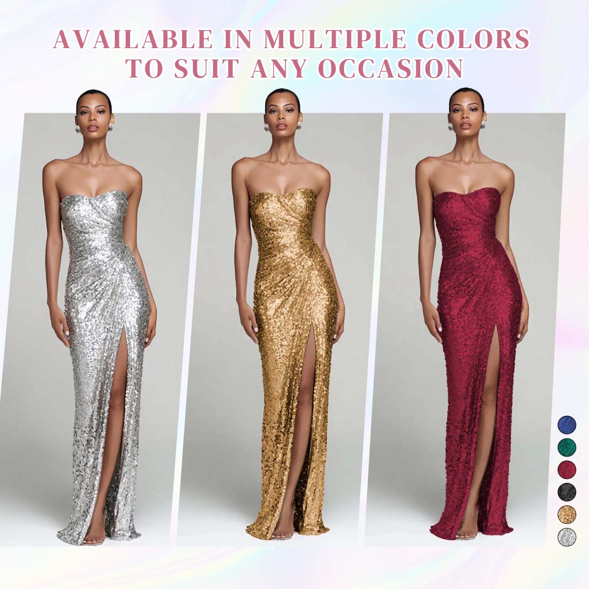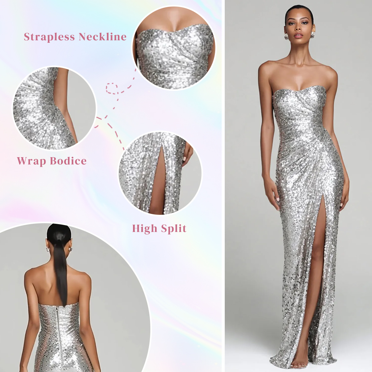 Featured: Sparkle and shine in this glamorous silver sequin gown. Designed with a flattering strapless sweetheart neckline, this dress contours your figure with its curve-hugging fit. The thigh-high slit adds a sultry touch, while the full-length skirt elegantly flows, creating a perfect balance of grace and allure.