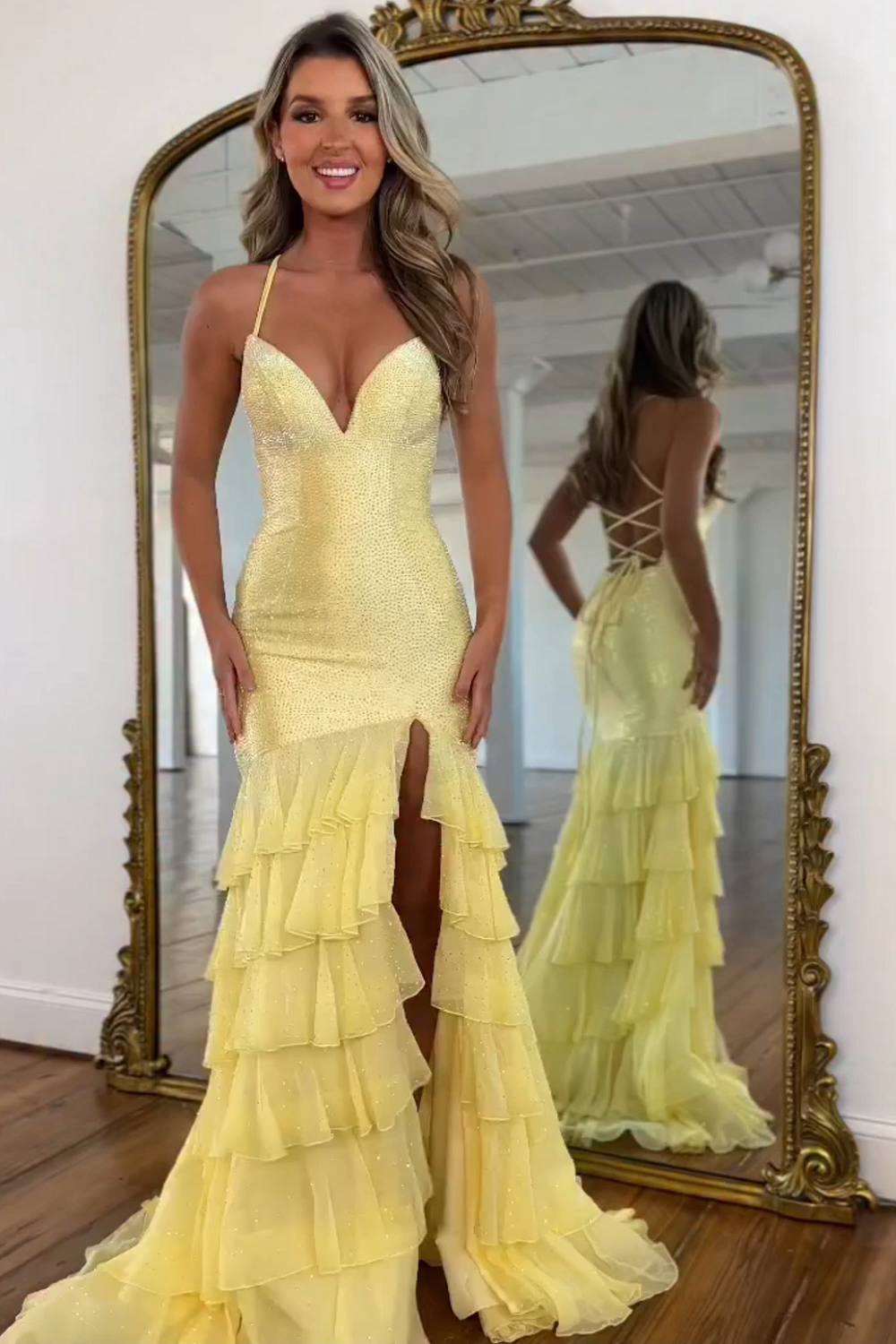 Sparkly Yellow Mermaid Tiered Backless Long Beaded Prom Dress with Slit