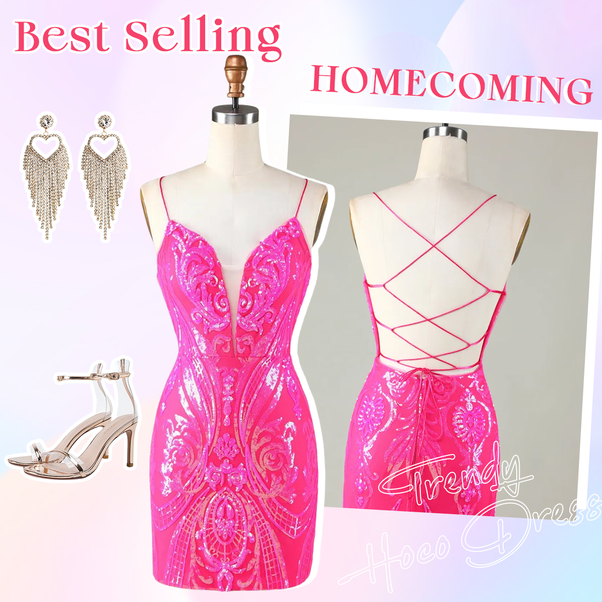 Stylish Bodycon Spaghetti Straps Hot Pink Short Homecoming Dress with Criss Cross Back