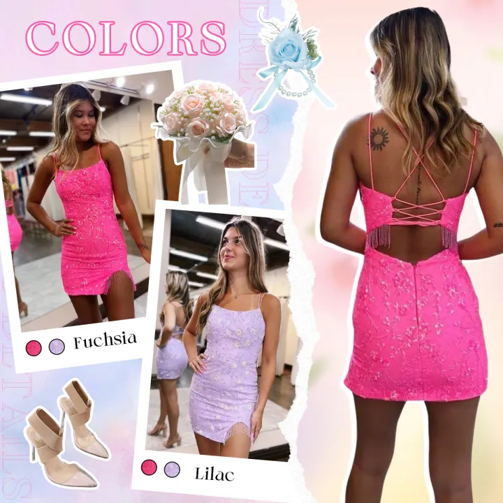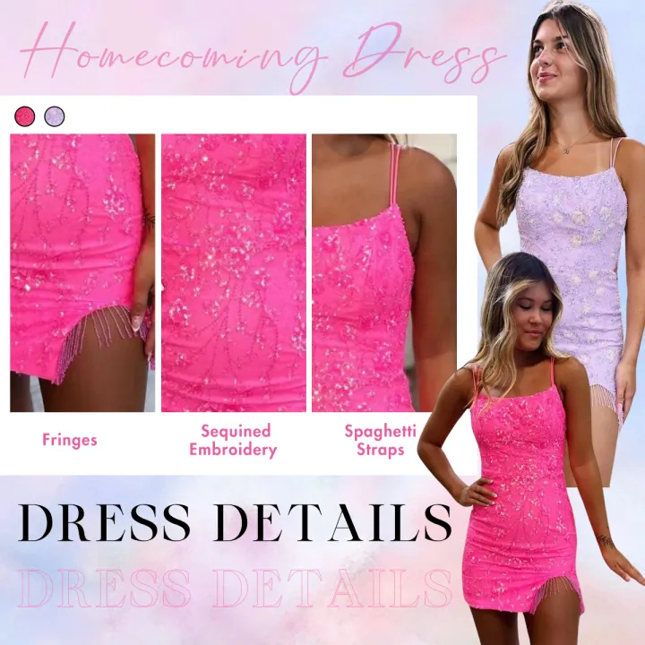 Feature: Turn heads in this stunning sparkly short prom dress. Made from soft fabric, it features a bodycon bodice with appliqued details, a spaghetti straps design, and a built-in bra for a flawless fit. The daring front split and fringes add modern elegance, making it perfect for prom or special events. Get ready to shine and receive endless compliments!