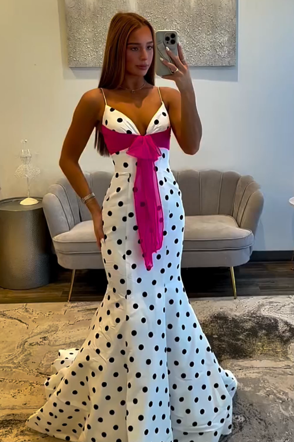 White Black Dot Mermaid Satin Spaghetti Straps Long Prom Dress with Sash