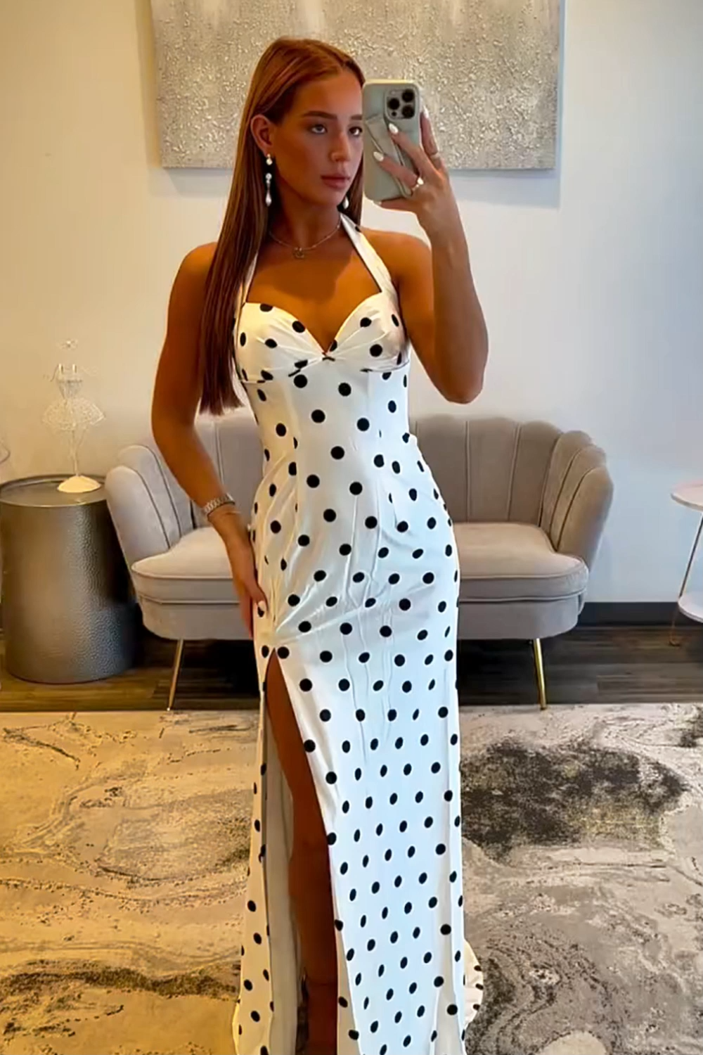 White Black Dot Sheath Halter Long Corset Prom Dress with Slit