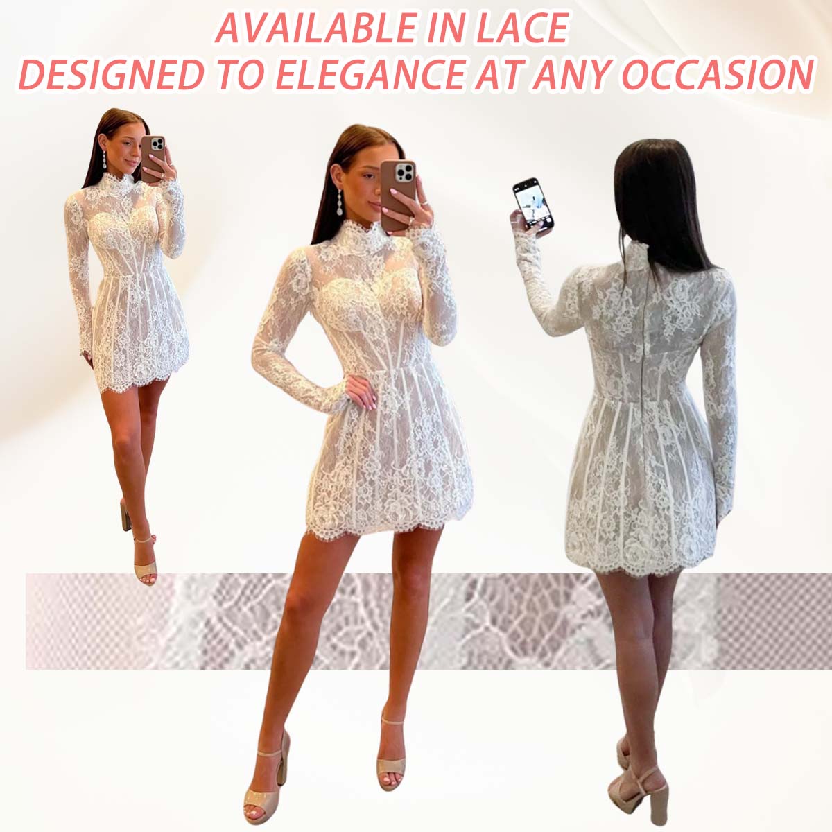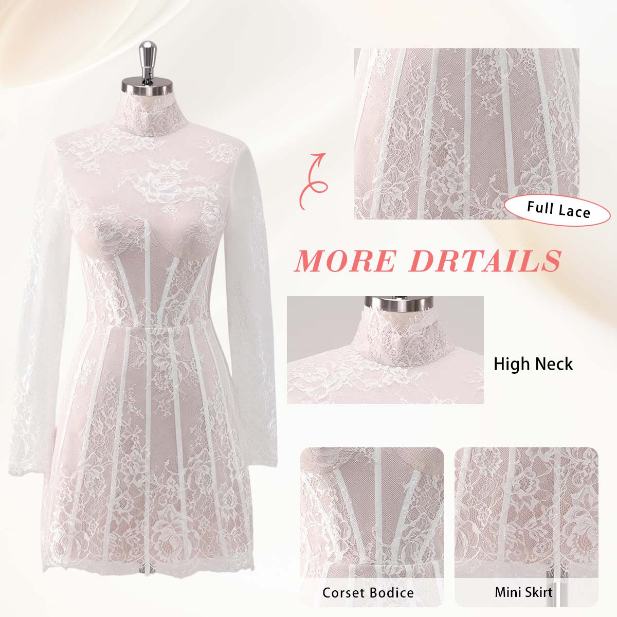 Featured: Turn heads in this stunning short prom dress. Made from lace fabric, it features a line bodice with lace details, a long sleeves design, and a built-in bra for a flawless fit. The daring corset and high neckline add modern elegance, making it perfect for prom or special events. Get ready to shine and receive endless compliments!